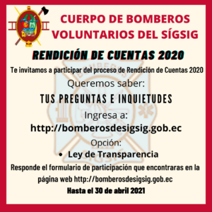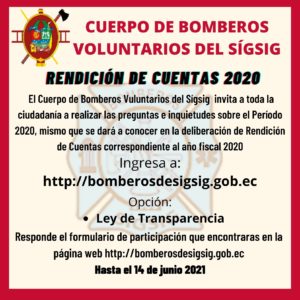 Te invitamos a ser parte de este proceso de Rendición de Cuentas 2020 del Cuerpo de Bomberos Voluntarios del Sígsig.