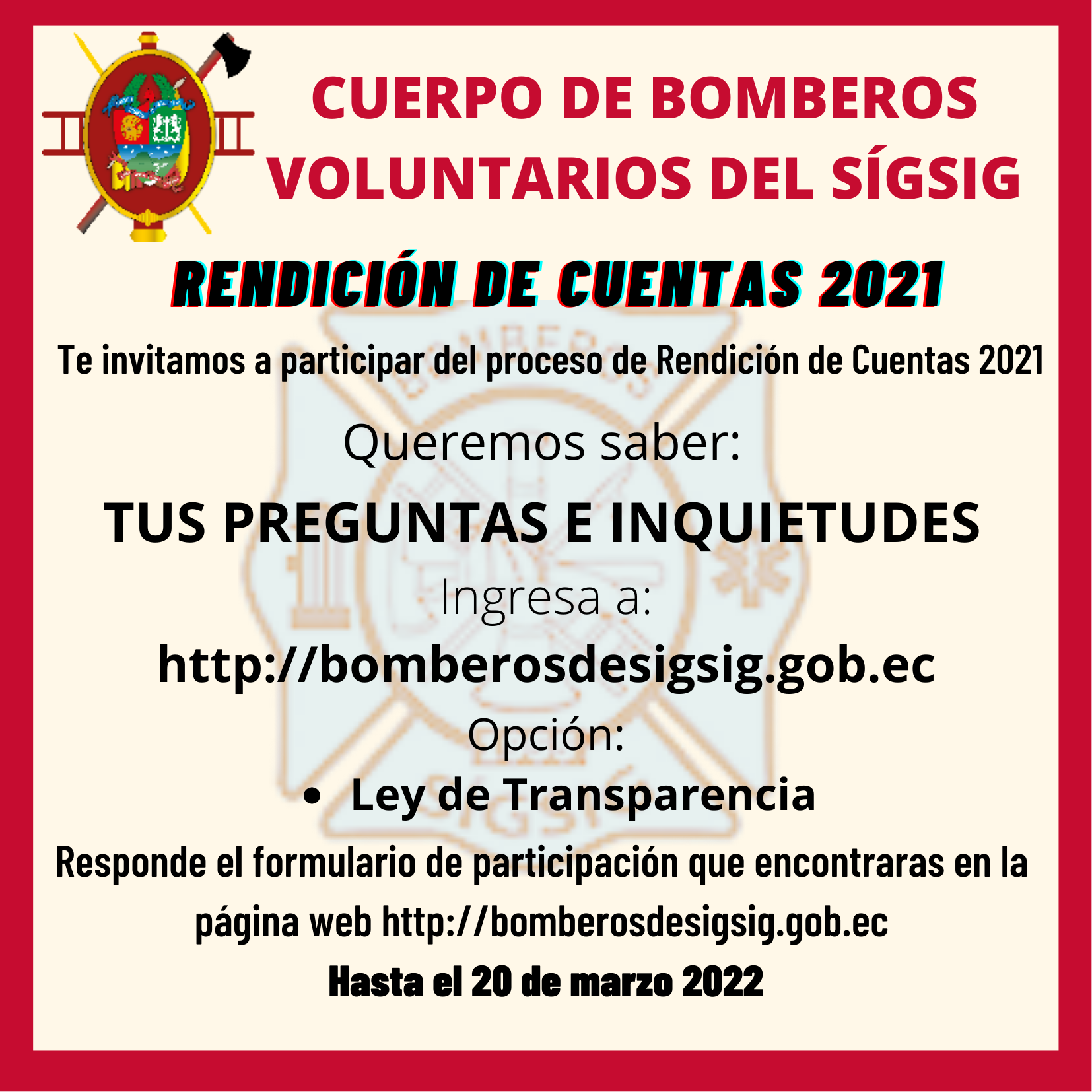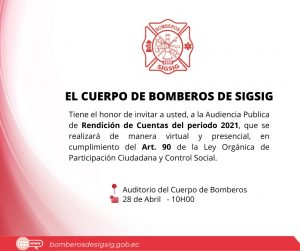 Te invitamos a ser parte de este proceso de Rendición de Cuentas 2021 del Cuerpo de Bomberos Voluntarios del Sígsig.