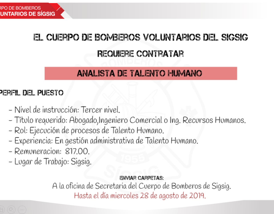 El Cuerpo de Bomberos Voluntarios del Sígsig, mediante la presente, busca CONTRATAR UN ANALISTA DE TALENTO HUMANO MISIÓN Administrar la Gestión de Talento Humano en el […]